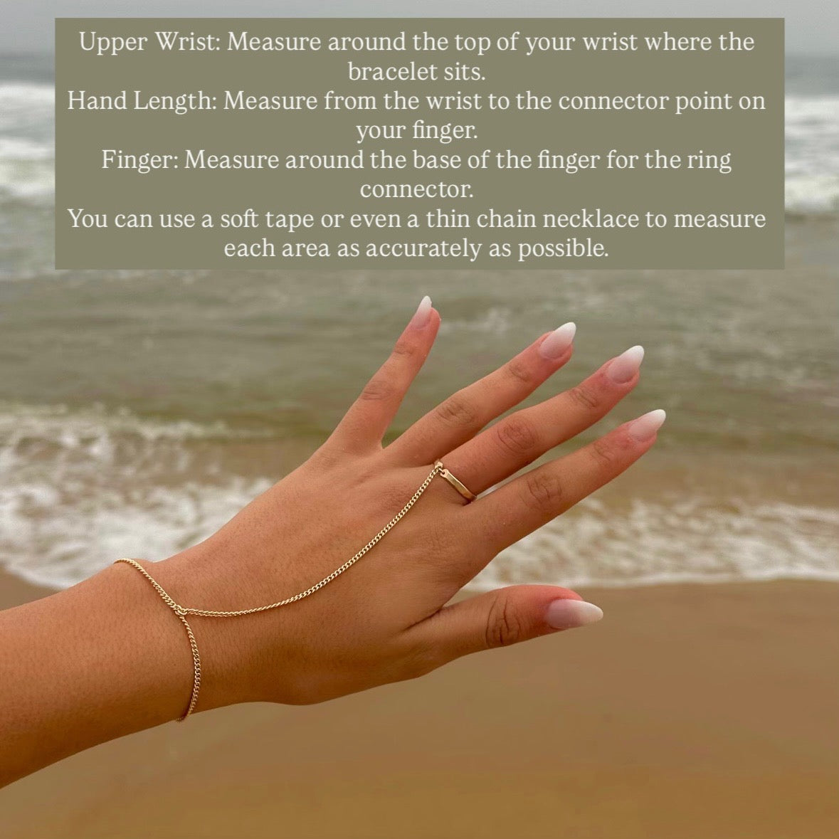Measure around the base of the finger you’d like your hand chain to connect to (typically the middle finger).
