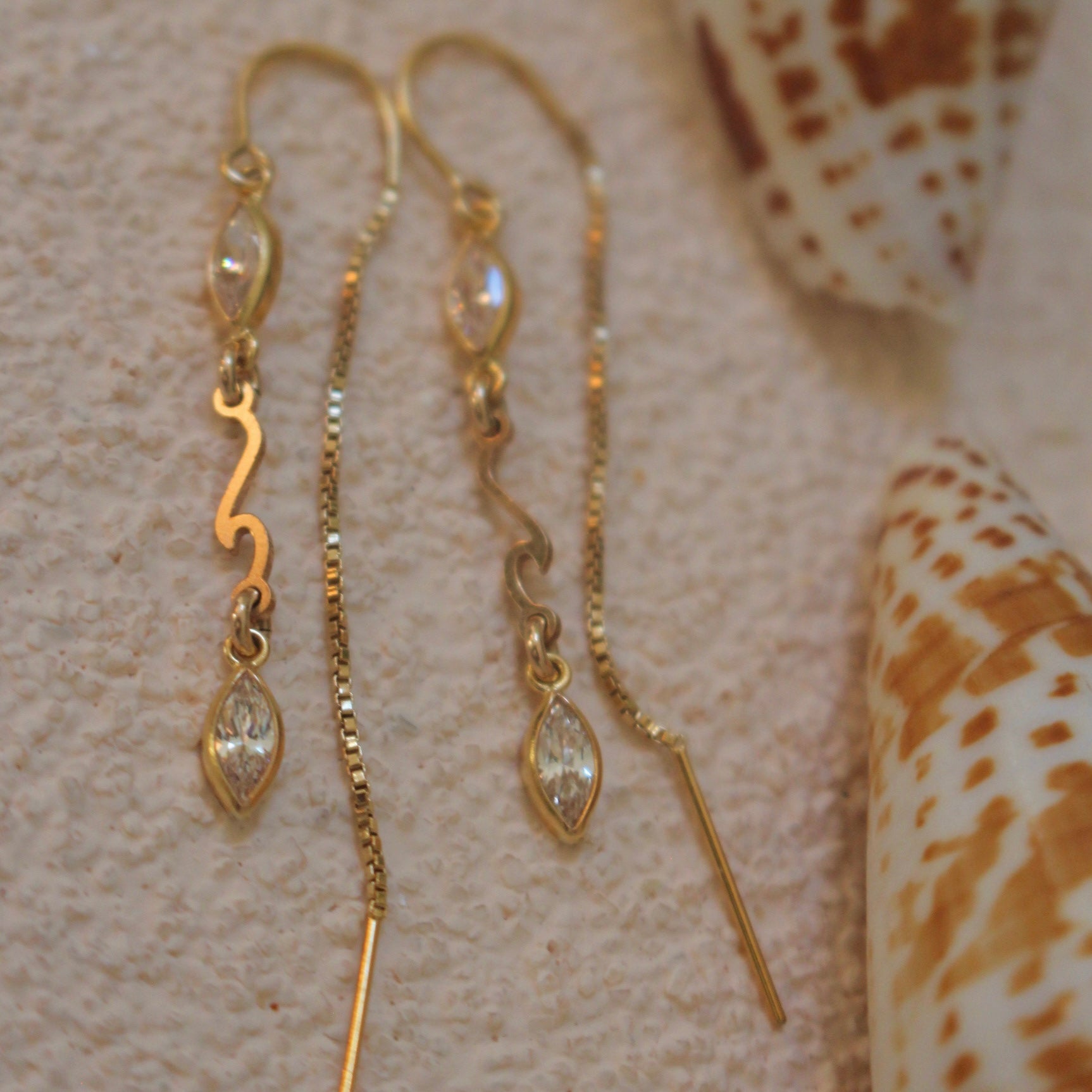 A threader earring has a charm on one end and a fine chain on the other that pulls through the ear for an airy, minimal look.