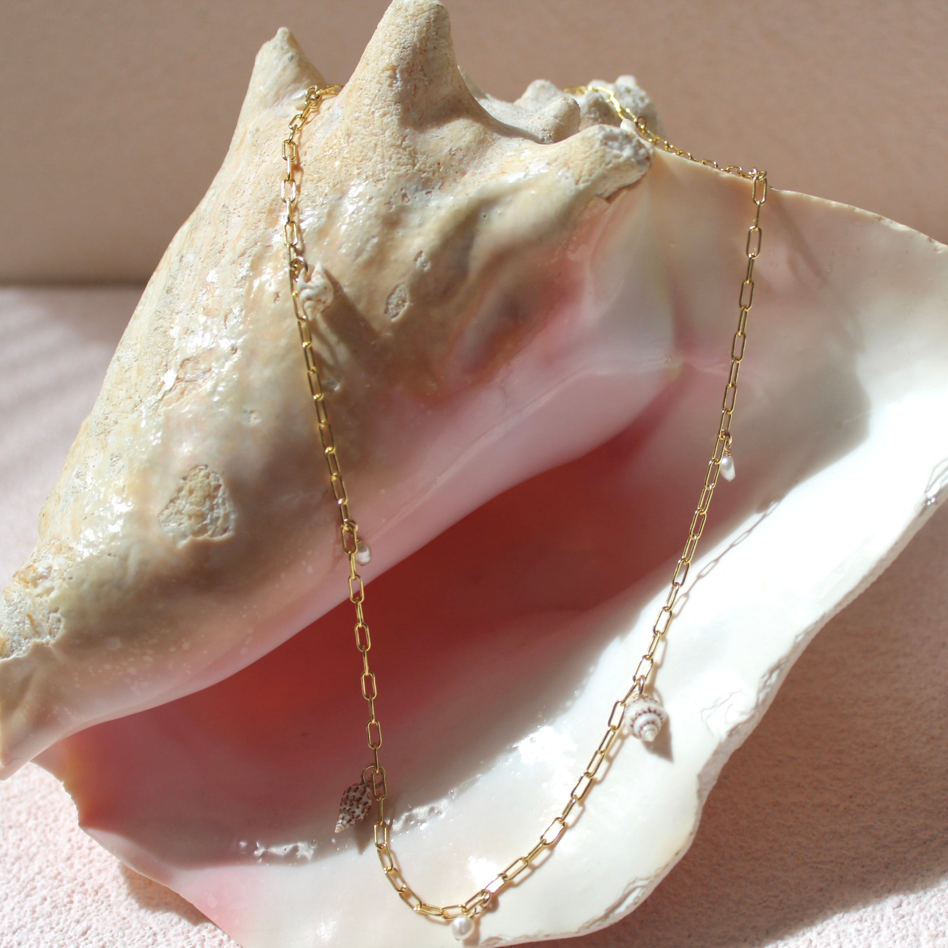 Details: 32" gold-filled CERO chain with small sea shells and small white freshwater pearls