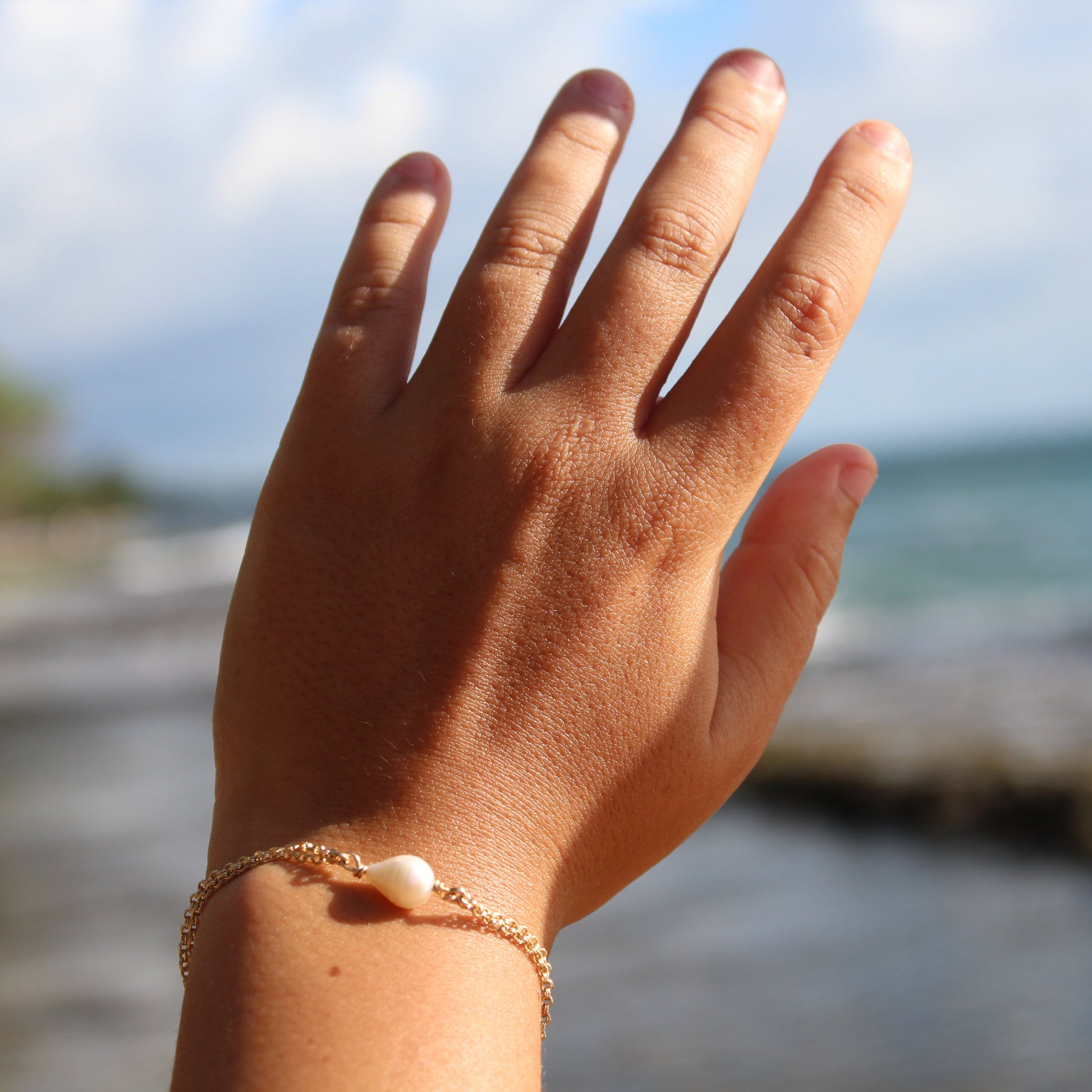 Details: 7" gold-filled MAHI double chain bracelet with a white freshwater pearl