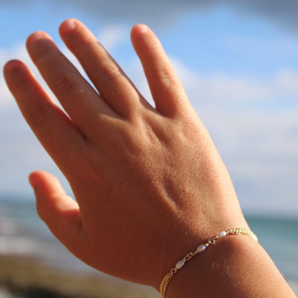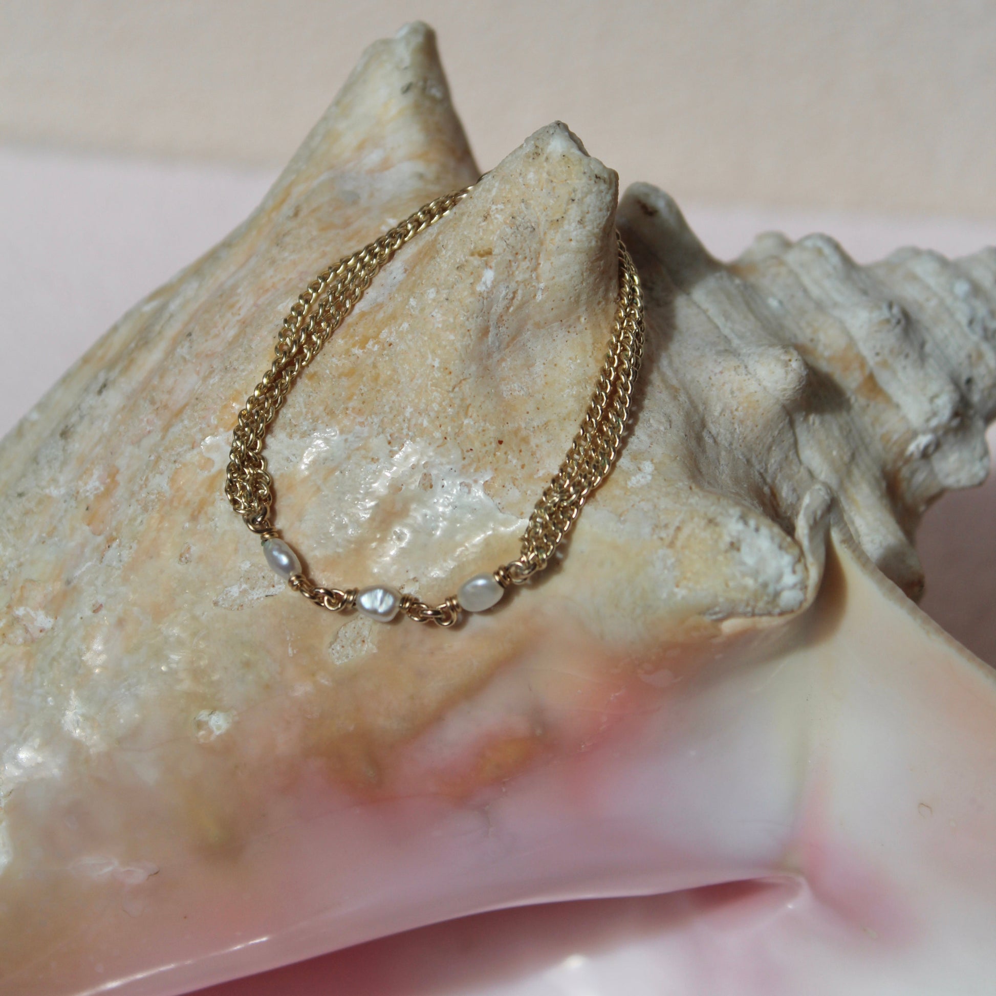 Details: 6" gold-filled ONO triple chain bracelet with three white freshwater pearls