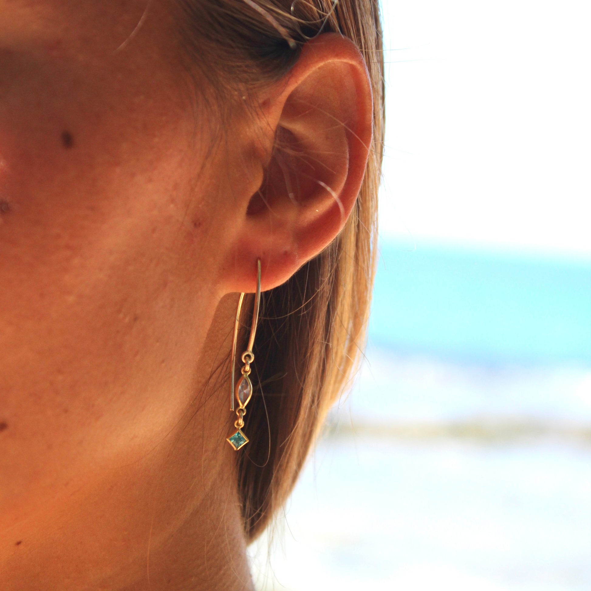 Details: Gold-filled hook earring with one turquoise gemstone and one aquamarine gemstone