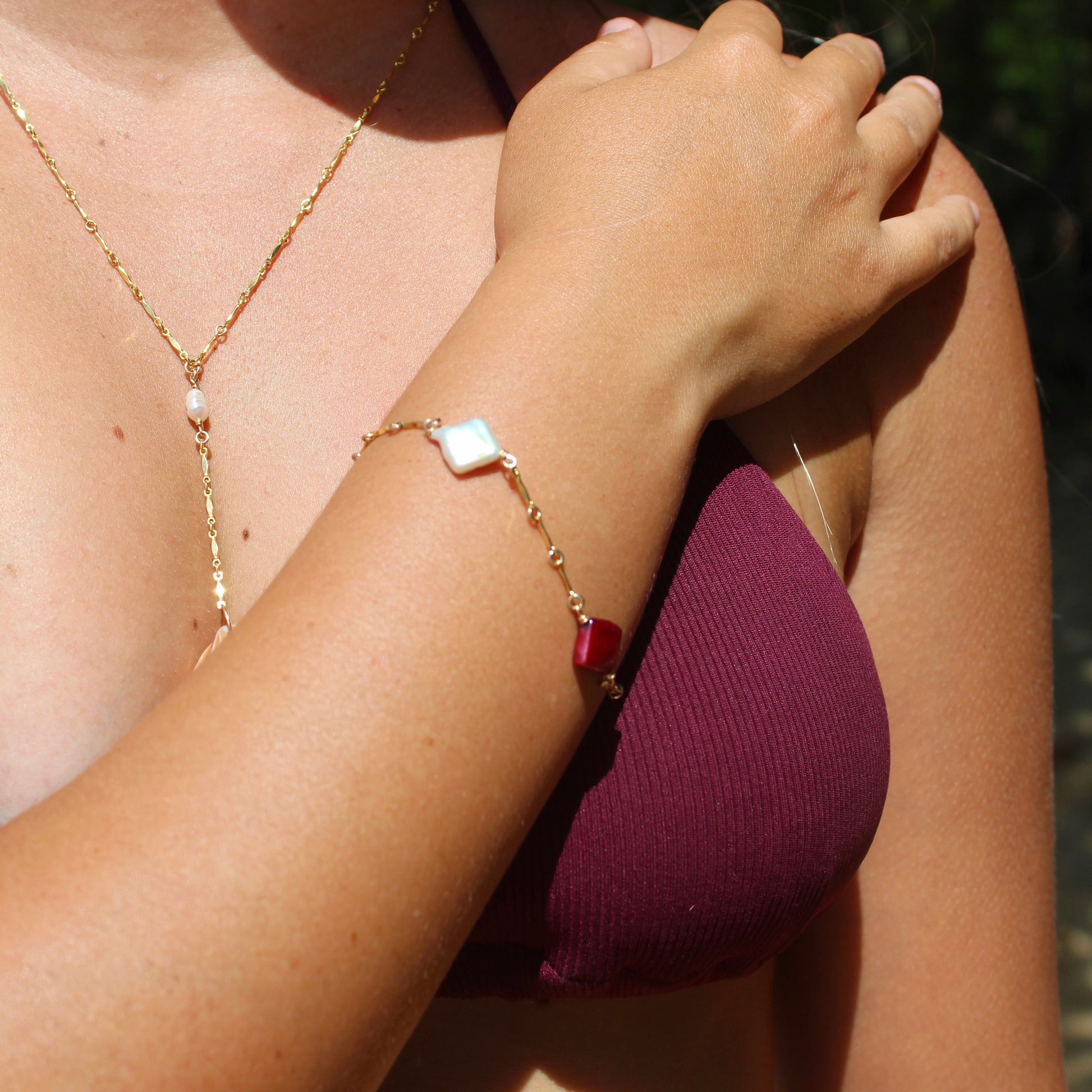 Sun-kissed and effortless chic. This dainty gold-filled bracelet with freshwater pearls is perfect to add a pop of color to your stack.