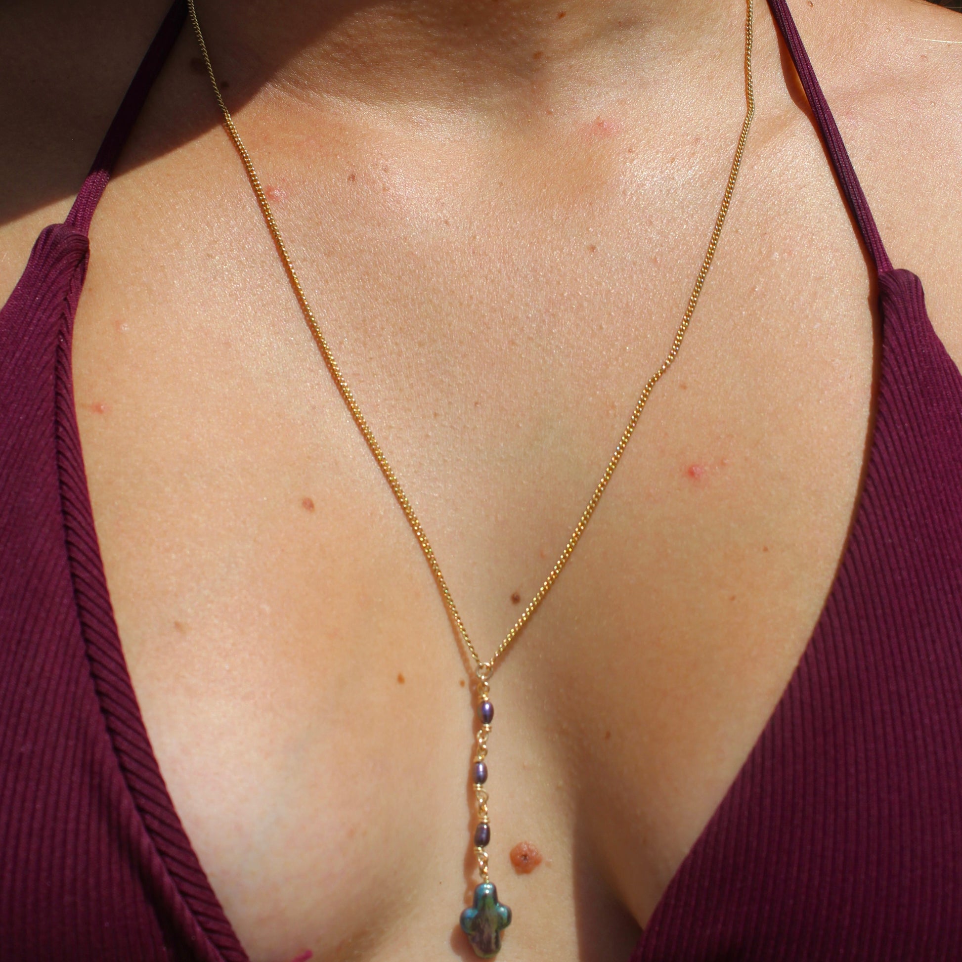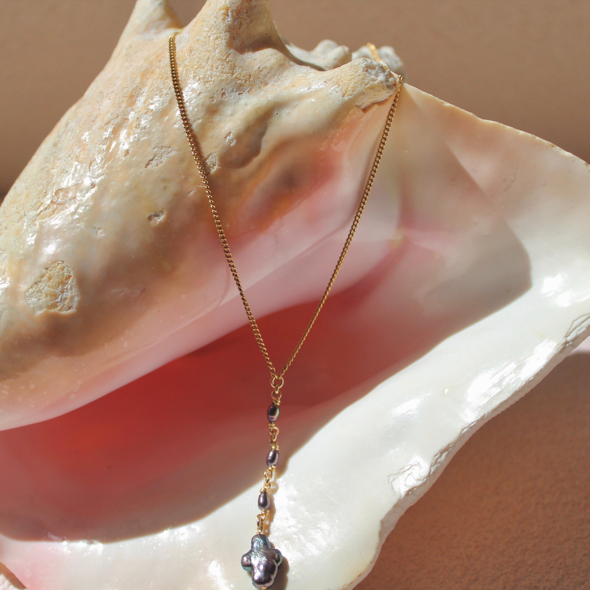 A must have for ocean lovers. This 21.5” inch gold-filled lariat with freshwater pearls is the ultimate beach girl must have.