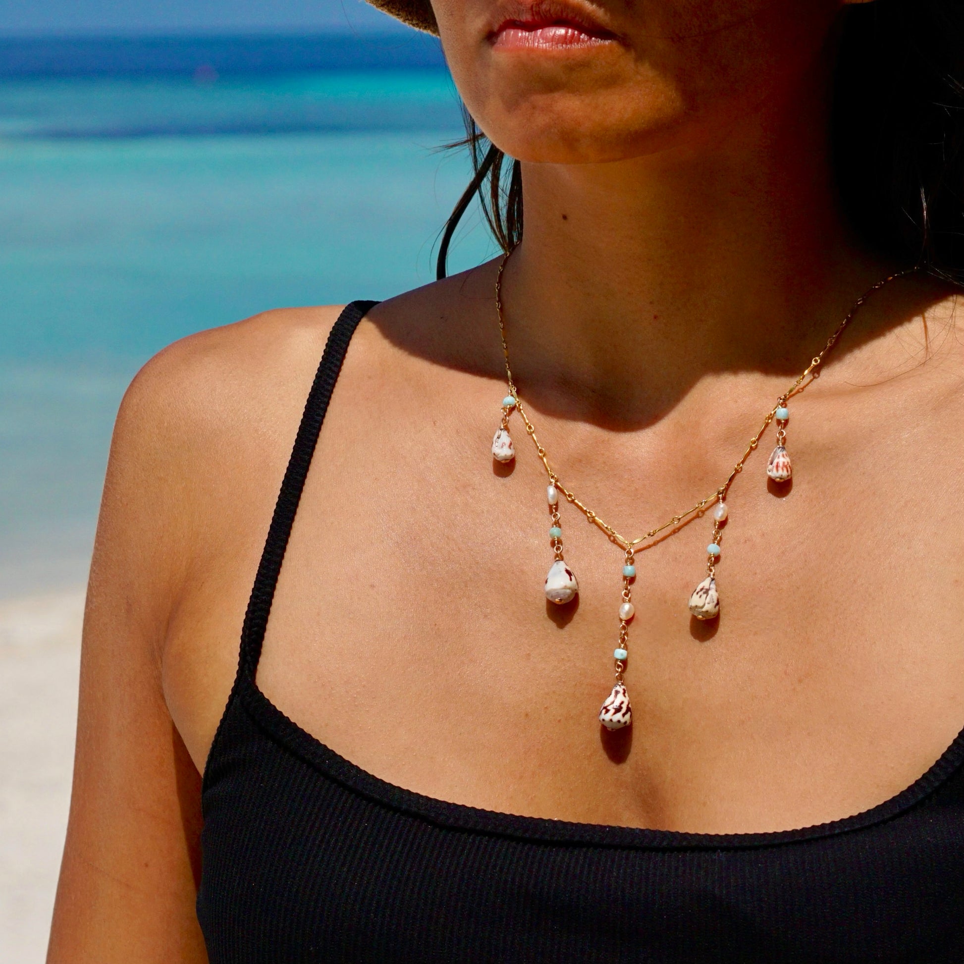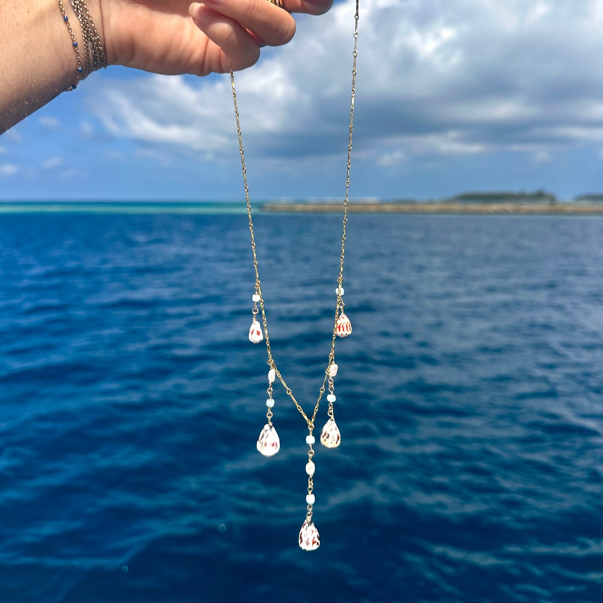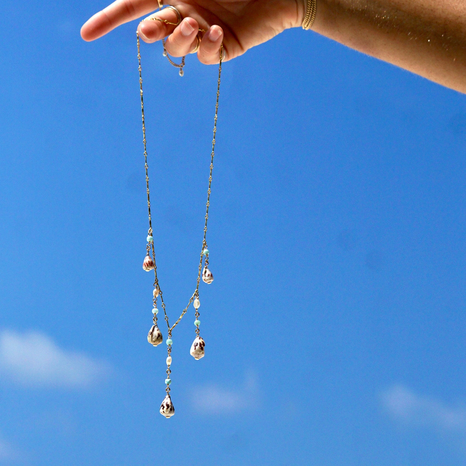 Details: 20" Cone shell chandelier on gold-filled SNAPPER chain with Hawaiian cone shells mixed with freshwater pearls and amazonite crystal beads