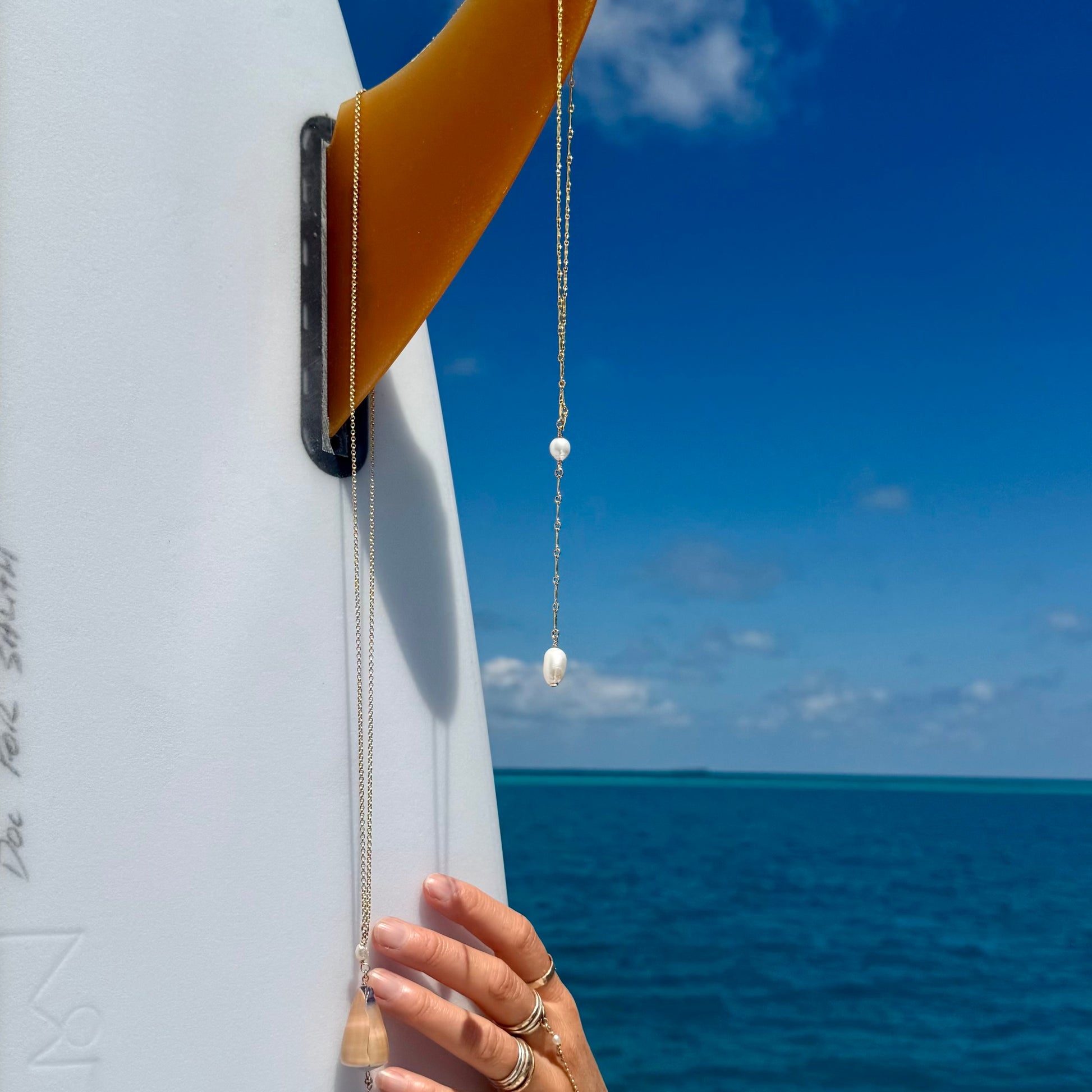 Mermaid approved Jewelry. Wear anytime, our jewels were designed to live in and out of the water. We work with Gold, Gold Filled, Rose Gold Filled & Sterling Silver which wear well over time with light cleaning with warm soapy water or polishing cloth. (If we ever use gold plate, we will specify) We do suggest taking off jewelry in chlorinated waters as some chemicals can be harsh and create tarnish. If you’re a Merbabe, please know we wear our jewels in the ocean as much as possible, however your jewels may start to look a little less shiny which can be caused by salt corrosion after long exposure of salty seas.
